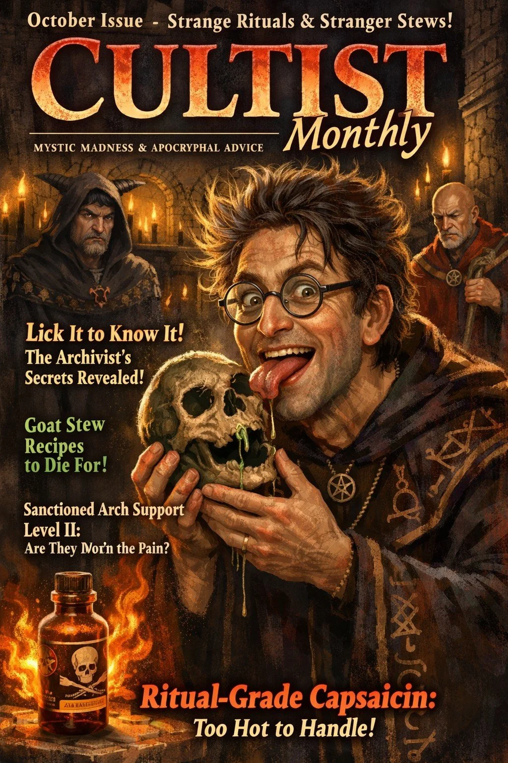 Cultist Monthly: News From Beyond the Circle is dedicated to helping those who serve dark, unknowable, or poorly organized powers stay informed about life beyond the ritual chamber. Topics may include stories, recipes, field advisories, strange occurrences, and other practical concerns for the modern cult-adjacent reader.